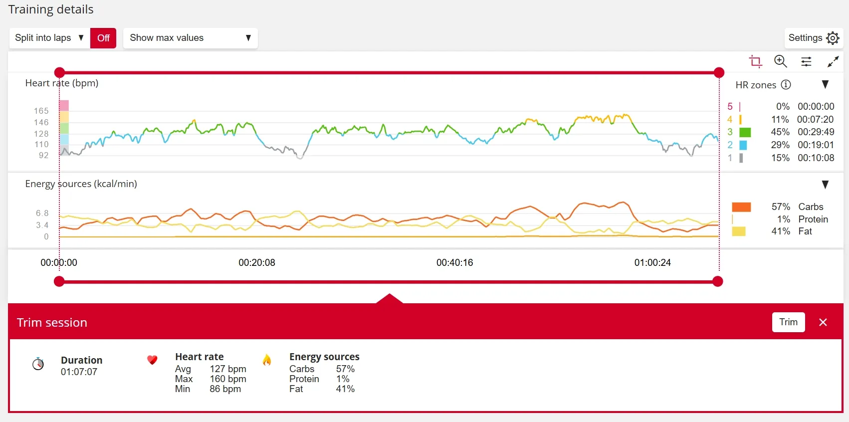 Drag the round red handles to the desired training session start and end times, then click Trim.