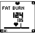 ![]() | FATBURN (Fedtforbrænding) (hjertesymbolet befinder sig på den venstre side af linien) I fedtforbrændingszonen er træningsintensiteten lavere, og energikilden er hovedsageligt fedt. Derfor forbrændes fedt effektivt, og din forbrænding, hovedsageligt fedtiltning, øges. |