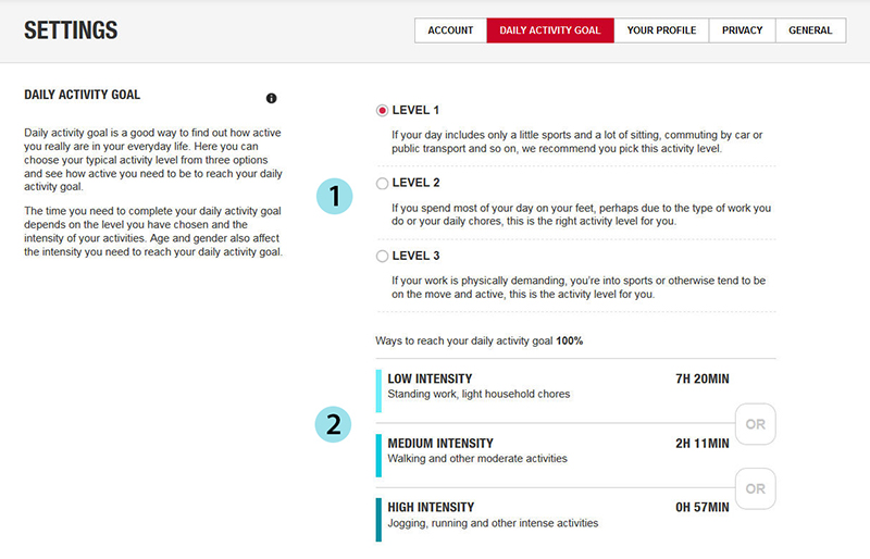 Die Einstellung für das tägliche Aktivitätsziel ermöglicht es dir, aus drei Optionen das Aktivitätsniveau zu wählen, das deinen typischen Tag und deine Aktivität am besten beschreibt (siehe Nr. 1 im nachstehenden Bild). Unter dem Auswahlbereich (siehe Nr. 2 im nachstehenden Bild) kannst du sehen, wie aktiv du sein musst, um dein tägliches Aktivitätsziel auf dem gewählten Niveau zu erreichen. Wenn du z. B. im Büro arbeitest und den Großteil des Tages im Sitzen verbringst, werden für einen gewöhnlichen Tag vier Stunden Aktivität mit geringer Intensität erwartet. Für Personen, die während der Arbeitszeit viel stehen und laufen, sind die Erwartungen höher.