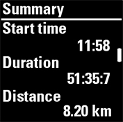 Tid när du startade träningspasset, träningstiden och tillryggalagd sträcka under träningspasset.