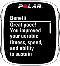 Feedback in Textform zur Wirkung jeder Trainingseinheit. Das Feedback basiert auf der Verteilung der Trainingszeit zwischen den einzelnen Herzfrequenz-Zonen, dem Kalorienverbrauch und der Dauer der Trainingseinheit. Drücke die -Taste, um mehr Details anzuzeigen.