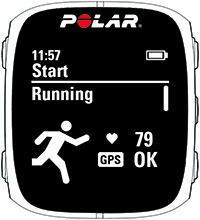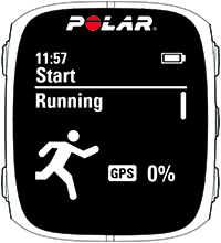 Hvis du har på deg en Polar-pulssensor som er koblet til M430, bruker M430 automatisk den tilkoblede sensoren for å måle pulsen din i løpet av treningsøkter. Bluetooth-ikonet på pulssymbolet indikerer at M430 bruker den tilkoblede sensoren for å måle pulsen din.GPS: Prosentverdien ved siden av GPS-ikonet indikerer når GPS-funksjonen er klar. Når verdien når 100 %, vises OK og du er klar til å starte.