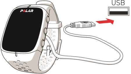 Koble M430 til datamaskinens USB-port eller en USB-lader ved hjelp av kabelen som fulgte med i esken. Velg språk vises. Trykk på for å velge English. M430 leveres med bare engelsk, men du kan legge til andre språk når du utfører oppsettet i Polar Flow-nettjenesten eller via Polar Flow-appen.
