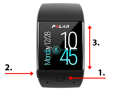 - 長按此按鈕直至看到 Polar 標誌,可重啟手錶。