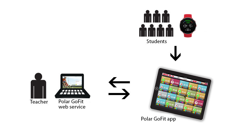 Before PE lesson: Course and student data is synchronized from Polar GoFit to the Polar GoFit app.