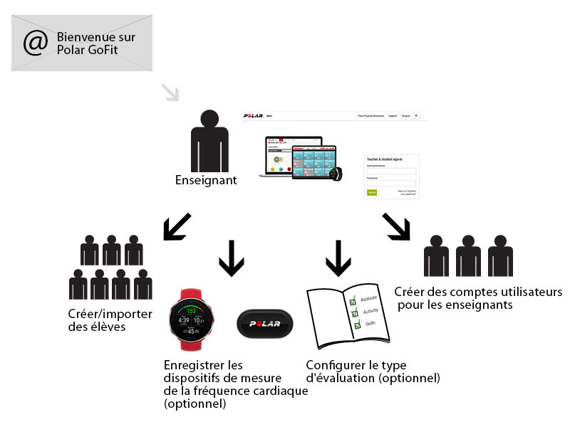 Il est recommandé d'exécuter les étapes suivantes lorsque le service Web Polar GoFit commence à être utilisé dans l'école. Les réglages de l'école peuvent être modifiés plus tard avec n'importe quel compte utilisateur de professeur.