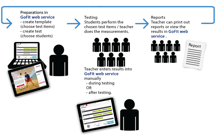 Der allgemeine Fitnesstest-Workflow im Polar GoFit Webservice wird unten beschrieben. Richte zuerst das System ein. Erstelle dann eine Vorlage und mache weiter, wie im Bild unten gezeigt.