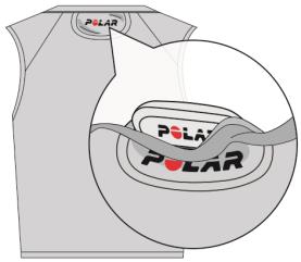- Stecke den Sensor in die Tasche am oberen Rücken des Shirts, sodass das Polar Logo am Sensor aufrecht ist.
