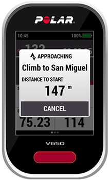 - Cyklopočítač V650 vás upozorní zvukovou signalizací, když se přiblížíte k segmentu Strava, a zobrazí vzdálenost do začátku segmentu. Segment můžete zrušit klepnutím na ZRUŠIT na cyklopočítači V650.