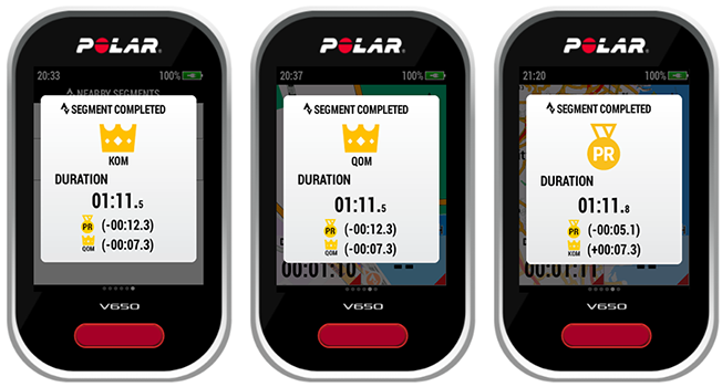 - Når du har fullført segmentet, viser V650 segmenttiden din, tidsdifferansen mellom PR og tidsdifferansen mellom KOM/QOM.