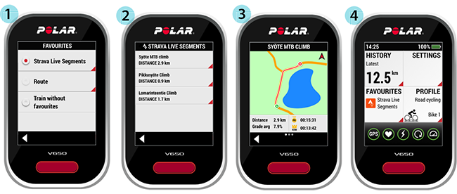 - Gå til FAVORITTER og trykk på alternativknappen for å aktivere Strava Live-segmentene. Hvis du vil se en liste over alle segmentene du har overført til V650, trykker du på feltet Strava Live-segmenter.