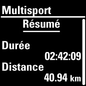 Le résumé multisport fournit des informations générales sur l'ensemble de la séance d'entraînement. Durée Distance Appuyez sur pour plus de renseignements sur l'ensemble de la séance. Pour consulter des informations détaillées sur chaque sport, parcourez la liste via et appuyez sur dans le résumé du sport. |