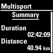 Multisport Summary (Sažetak za više sportova) vam pruža opće podatke o cijelom vježbanju. Trajanje Udaljenost Pritisnite gumb za za prikaz dodatnih pojedinosti o cijelom vježbanju. Za prikaz detaljnih podataka o pojedinom sportu, pomaknite se koristeći gumbe za pa pritisnite gumb za u sažetku sporta. |