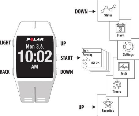 V800 has five buttons that have different functionalities depending on the situation of use. In addition to these, V800 also includes taps gestures. They're performed by tapping the display of your V800, and allow you to view information on the display or perform functions during training.