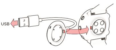 - Kella laadimiseks ühenda see kaasasoleva kaabli abil võrgutoitega USB-liidese või USB-laadijaga. Kaabel klõpsatab magnetiga oma kohale, kuid jälgi, et sellel olev eend oleks kella tagaküljel asuva süvendiga (märgitud punasega) täpselt kohakuti.