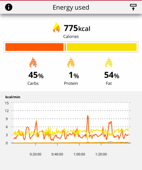 Flow' rakenduses kuvatakse lisaks seda, kui palju kasutasid energiaallikaid konkreetsetes treeninguetappides ja kogu treeningu jooksul. Graafik näitab, kuidas sinu keha kasutab erinevaid energiaallikaid erinevatel intensiivsuse tasemetel ja erinevates treeninguetappides. Lisaks saad võrrelda sarnaste treeningukordade energiaallikajaotust pikema aja jooksul ja vaadata, kuidas areneb sinu keha võime kasutada esmase energiaallikana rasva. |