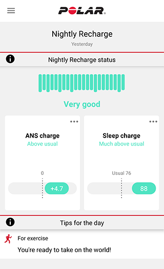 Nightly Recharge'i olekut saad vaadata nii kellas kui ka Polar Flow' rakenduses. Mõõdetud andmete põhjal saad Polar Flow' rakenduses treeninguteks isiklikke näpunäiteid ning soovitusi, kuidas eriti rasketel päevadel parandada und ja reguleerida energiataset. Funktsioon Nightly Recharge aitab sul üldise heaolu säilitamiseks ja treeningueesmärkide saavutamiseks teha igapäevaelus optimaalseid valikuid.