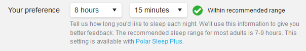 - Az első lépés, amit meg kell tenned, az a kívánt alvásidő beállítása a Polar Flow alkalmazásban vagy az órádon. Koppints a profilra a Polar Flow alkalmazásban, majd válaszd a Kívánt alvásidő lehetőséget. Válaszd ki a kívánt időtartamot, majd koppints a Kész lehetőségre. Másik lehetőségként jelentkezz be a Flow-fiókodba, vagy hozz létre egyet a flow.polar.com oldalon, majd válaszd a Beállítások > Fizikai beállítások > Kívánt alvásidő pontot. Állítsd be a kívánt időtartamot, majd válaszd a Mentés lehetőséget. Az órán a Beállítások > Fizikai beállítások > Kívánt alvásidő pontban tudod beállítani a kívánt alvásidőt.