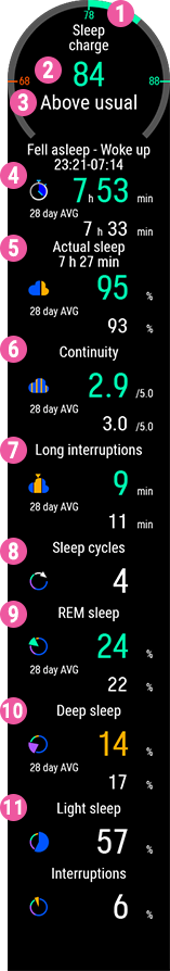 - Alvásfolytonosság (1–5): Az alvásfolytonosság azt értékeli, hogy az alvási idő mennyire volt folytonos. Az alvásfolytonosságot egy egytől ötig terjedő skálán értékeljük: szakaszos – nagyjából szakaszos – nagyjából folyamatos – folyamatos – nagyon folyamatos.