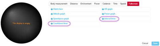 Aby używać timerów podczas treningu, musisz dodać je do swoich ekranów treningowych. Możesz to zrobić, ustawiając widok timera dla bieżącej sesji treningowej przy użyciu menu podręcznego lub dodając timery do ekranów treningowych profilu sportowego w ustawieniach profilu sportowego w serwisie Flow i synchronizując te ustawienia z zegarkiem.