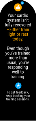 Kuvake, joka kuvaa päivän valmiuttasi kardiotreeniin. Se kuvastaa suosituksemme mukaista päivittäistä treenisuositusta. Treenisuosituskuvakkeen tilalla näkyy varoituskuvake, jos loukkaantumis- tai sairastumisriskisi on kohonnut. Lyhyt treenisuositus voi olla: