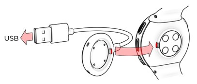 若需唤醒您的手表并充电,请利用随盒子附上的连接线,把手表插进供电的 USB 端口或 USB 充电器中。连接线以磁力方式卡入到位,只需确保将连接线上的突出部分与手表上的插槽对齐即可(用红色标记)。请注意,可能需要一定的时间显示屏上才会显示充电状态动画。我们推荐您在开始使用手表前对电池进行充电。查看电池,了解电池充电的详细信息。或者,长按“OK(确定)”按钮 4 秒钟,唤醒手表。
