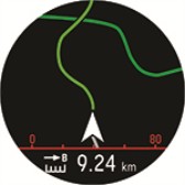 Funksjonen Ruteveiledning veileder deg langs ruter du har registrert i tidligere økter, eller ruter som andre brukere av Flow-nettjenesten har registrert og delt. Du kan velge til gå til rutens startpunkt, endepunkt eller nærmeste punkt (underveis på ruten). Først veileder klokken deg til det valgte startpunktet på ruten. Deretter veileder klokken deg hele veien langs ruten og sørger for at du er på rett spor. Du følger ganske enkelt veiledningen på displayet. Nederst på displayet ser du hvor langt det er igjen.