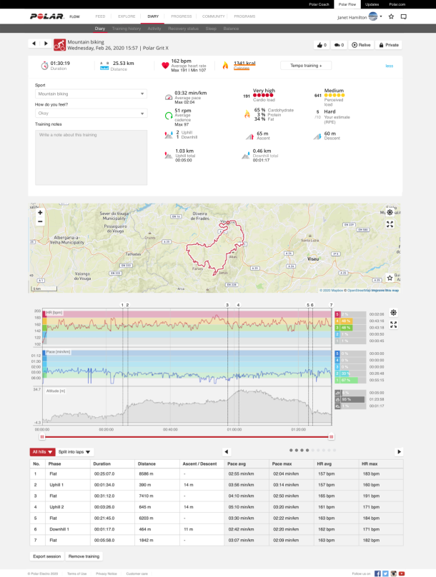 Näet kunkin ylämäki-, alamäki- ja tasamaasegmentin yksityiskohtaiset tiedot Flow-verkkopalvelussa, kun olet synkronoinut tiedot palveluun treenin jälkeen. Treenin yhteenveto on saatavilla myös Flow-sovelluksessa.