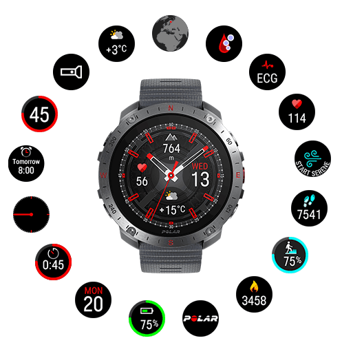Puedes elegir diferentes estilos y colores para la esfera del reloj Polar Grit X2 Pro entre un conjunto de opciones predefinidas. Asimismo, puedes elegir los widgets que se muestran en la esfera del reloj. Los widgets permiten ver la información de un vistazo y proporcionan un acceso rápido a las funciones. Descubre cómo hacerlo en Ajustes de esferas del reloj.