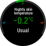 - 夜間の皮膚温の結果を腕時計に表示するには、その前に腕時計を3晩装着する必要があります。3晩が経過するとあなたの平均皮膚温が分かり、ベースライン(ゼロ)として表示されます。ベースラインの計算には、直近の過去の28晩が考慮されます。