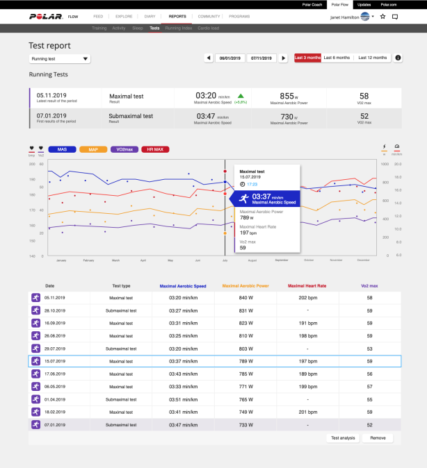 Če želite s testom tekaške zmogljivosti spremljati svoj napredek in izbrati ustrezno raven intenzivnosti treninga, vam priporočamo, da test ponovite vsake tri mesece in si tako priskrbite aktualne podatke o svojih območjih treninga. Če želite podrobneje spremljati svoj napredek, lahko submaksimalni test ponovite tolikokrat, kot želite, in sicer med posameznimi izvedbami maksimalnega testa.