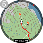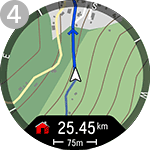 Po začetku vadbe se z gumboma NAVZGOR/NAVZDOL pomaknite do vpogleda v trening Navigacija z zemljevidom. Zemljevid lahko uporabljate samostojno (1) ali z drugimi navigacijskimi funkcijami, kot so Navodila za pot (2), Nazaj na začetek (3), Sledenje nazaj (4) in Zanimive točke (5).