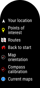 Če želite odpreti meni navigacije, pritisnite gumb V redu v načinu povečave ali dvakrat pritisnite gumb V redu v pogledu navigacije z zemljevidom. V meniju se nato prikažejo naslednje možnosti.