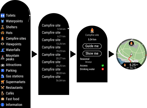 Saad oma orienteerumist täiustada huvipunktide abil, et hõlpsasti leida olulisi maamärke nagu varjualused, supermarketid, kohvikud ja palju muud. Ükskõik kas treenid või oled avastusretkel, huvipunkt aitab sul need asukohad kaardilt üles leida või pakub linnulennult teekonda koos distantsijuhistega sinu valitud punkti juurde. Samuti saad määrata oma kohandatud huvipunktid ja täpselt nende juurde orienteeruda. Funktsioon on saadaval nii treeningu ajal kui ka treeninguvälisel ajal.