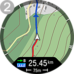 Po začetku vadbe se z gumboma NAVZGOR/NAVZDOL pomaknite do vpogleda v trening Navigacija z zemljevidom. Zemljevid lahko uporabljate samostojno (1) ali z drugimi navigacijskimi funkcijami, kot so Navodila za pot (2), Nazaj na začetek (3), Sledenje nazaj (4) in Zanimive točke (5).
