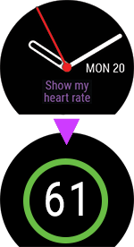 継続的な心拍計測機能を使用していない場合でも、トレーニング セッションを開始しなくても現在の心拍数をすばやく確認することができます。リストストラップを締め、この画面表示を選択し、ディスプレイをタップすると、現在の心拍数が確認できます。ボタンを押して、心拍数画面表示に戻ります。