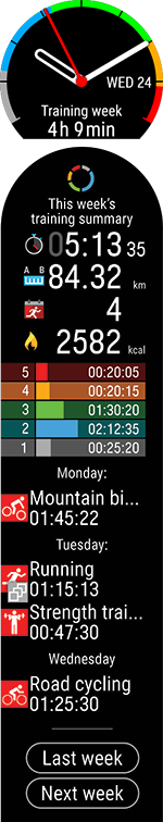 トレーニングのウィークリー概要を表示します。その週の総トレーニング時間は、異なるトレーニングゾーンにわけてグラフ表示されます。ディスプレイをタップして、詳細を開きます。距離、トレーニング セッション、総カロリー数、各心拍ゾーンで費やした時間をチェックできます。さらにここでは先週のデータ概要や詳細、また、翌週の予定済みのセッションを閲覧することが可能です。