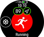 Jeśli masz założony sensor tętna Polar połączony z zegarkiem, zegarek będzie automatycznie używał połączonego sensora do pomiaru tętna podczas sesji treningowych. Niebieski okrąg wokół symbolu tętna oznacza, że zegarek używa połączonego sensora do pomiaru tętna. - Po wyszukaniu wszystkich sygnałów dotknij wyświetlacza, aby rozpocząć rejestrowanie treningu.