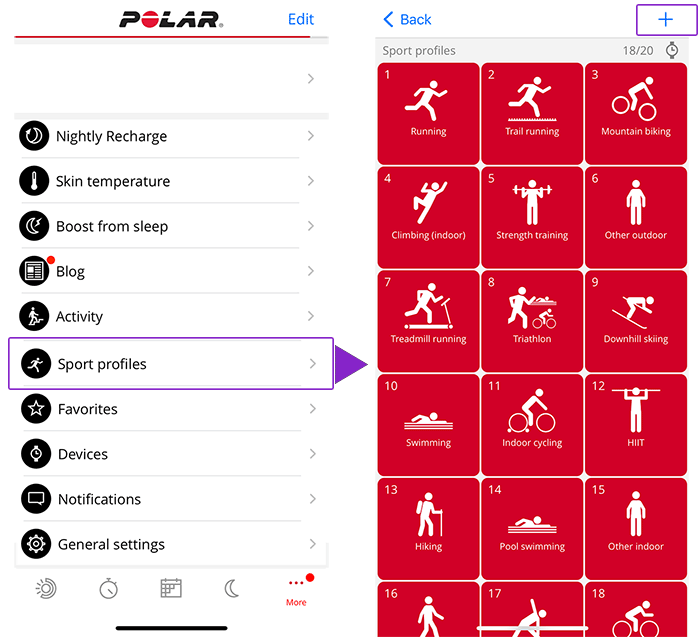 W zegarku domyślnie skonfigurowanych jest 14 profil sportowych. Dzięki aplikacji lub serwisowi Polar Flow możesz dodać do listy nowe profile sportowe i edytować ich ustawienia. Zegarek może zawierać maksymalnie 20 profili sportowych. Jeśli masz ponad 20 profili sportowych w aplikacji i serwisie Polar Flow, podczas synchronizacji do zegarka zostanie przeniesione pierwszych 20 pozycji z listy.