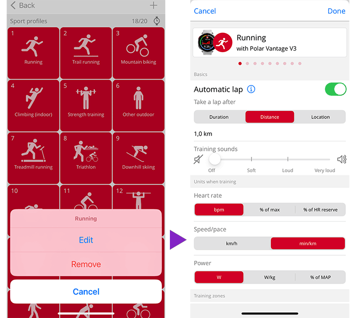Dla każdego profilu sportowego możesz również wprowadzić indywidualne ustawienia. Możesz na przykład tworzyć spersonalizowane ekrany treningowe dla każdego uprawianego sportu i wybrać dane, które chcesz wyświetlać podczas sesji. Zobacz dokument pomocy Jak edytować profile sportowe i ekrany treningowe w Polar Flow? aby uzyskać szczegółowe informacje na temat ustawień profilu sportowego zegarka.
