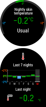 Saatiniz uyandığınızı algıladığında uyku esnasında ölçülen deri sıcaklığınızı 28 günlük ortalamayla karşılaştırır ve ortalamaya göre farkı gösterir. Ayrıntıları açarak son 7 geceye ait deri sıcaklığı ölçümlerini içeren grafiği görebilirsiniz.
