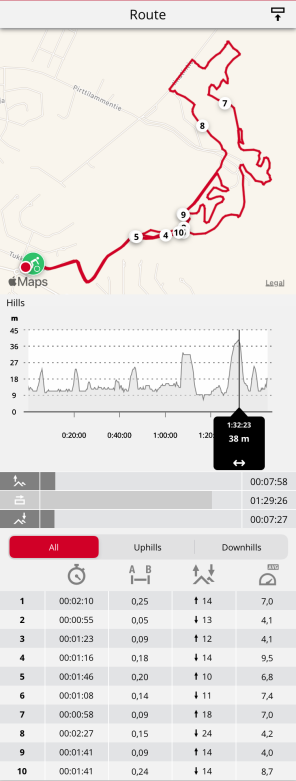 Díky funkci Hill Splitter™ budete vědět, jak jste si vedli v úsecích z kopce a do kopce. Hill Splitter™ automaticky detekuje všechna stoupání a klesání pomocí vašich GPS údajů o rychlosti a vzdálenosti a podle nadmořské výšky. Zobrazuje podrobné informace o vašem výkonu, jako např. vzdálenost, rychlost, stoupání a klesání, pro každý zjištěný kopec na vaší trase. Získáte údaje o výškovém profilu svého tréninku a můžete porovnat statistiku stoupání a klesání mezi různými tréninky. Podrobné informace o každém kopci se zaznamenávají automaticky, úseky není třeba zadávat manuálně.