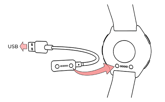 Chcete-li hodinky aktivovat a nabít, připojte je pomocí přibaleného kabelu k napájenému USB portu nebo k USB nabíječce. Kabel se magneticky přichytí na místo. Upozorňujeme, že může chvíli trvat, než se průběh dobíjení zobrazí na displeji. Doporučujeme, abyste předtím, než začnete hodinky používat, nabili baterii. Podrobné informace o tom, jak se baterie nabíjí, najdete v sekci Baterie.