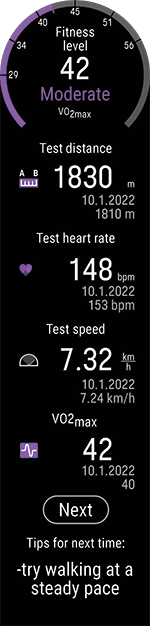 每次测试前的条件应该大致相同。例如,如果您在前一天进行了高强度训练,或者在测试前吃了一顿大餐,都会影响测试结果。在测试期间,应以稳定的配速尽可能快地行走。不允许跑步。尽量将您的心率保持在最大心率值的 65% 以上。没有上限值。您步行的距离越长,测试结果就越准确。如果心率过低,手表将提示您。这意味着您需要加快行走速度以提高心率。