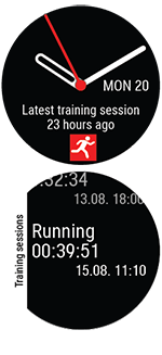 Gebruik in de tijdweergave de knoppen OMHOOG en OMLAAG om naar de displayweergave Laatste trainingssessies te bladeren en druk op OK.