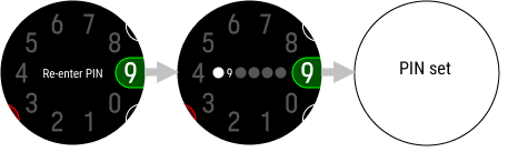 Se você digitar um PIN incorreto três vezes consecutivas, o relógio ficará bloqueado por um minuto. As tentativas incorretas conseguintes aumentarão o tempo de espera para cinco minutos. Após várias tentativas sem sucesso, o relógio solicitará a redefinição do PIN por meio da reconfiguração de fábrica.
