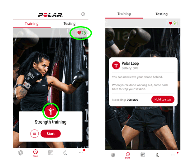 Quando registri con il dispositivo, devi avviare e interrompere manualmente la sessione tramite l'app Polar Flow, ma non serve che porti lo smartphone con te durante l'allenamento. Una volta avviata, la registrazione viene gestita dal dispositivo. Quando usi il dispositivo da solo, vengono registrati solo i dati della frequenza cardiaca.