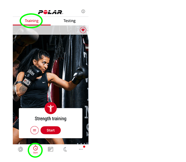 トレーニングページで、スポーツアイコンをタップしてスポーツプロファイルを選択します。現在の心拍数が表示されたら、スタートをタップしてトレーニング セッションを開始します。