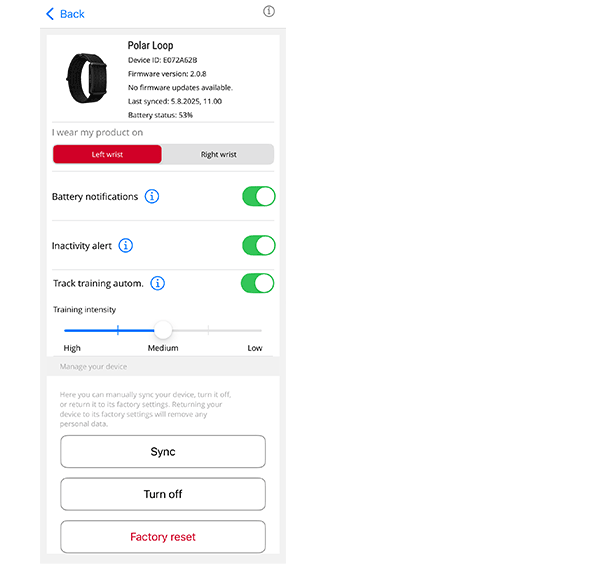 Flowアプリで、 ダイアリーのデバイスカードをタップしてデバイス設定を開きます。Polarデバイスを2台以上お持ちの場合は、「デバイス」 に進み、Polar Loopを選択することもできます。