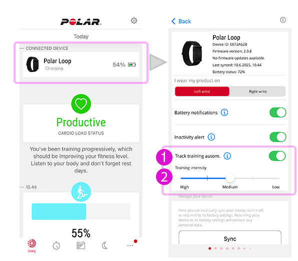 Samodejno zaznavanje treningov je privzeto vklopljeno. Vklopite ali izklopite ga lahko med nastavitvijo ali pozneje v nastavitvah naprave v aplikaciji Flow, kjer lahko prilagodite tudi njegovo občutljivost.